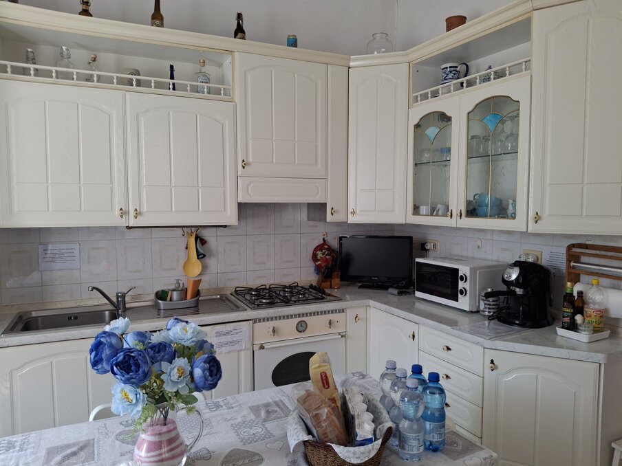 La cucina è fornita di stoviglie, piano cottura, forno elettrico, forno a microonde, bollitore, macchina per caffè all’ americana, caffettiere, lavastoviglie, frigorifero con scomparto congelatore, tavola da pranzo fino a sei posti, tv sat, eventuale seggiolone per bimbi. Nel soggiorno con divano, fornito di tv sat a schermo piatto, sono disponibili giochi di società, giochi per bambini, libri, puzzle, impianto radio-cd e lettore DVD .
